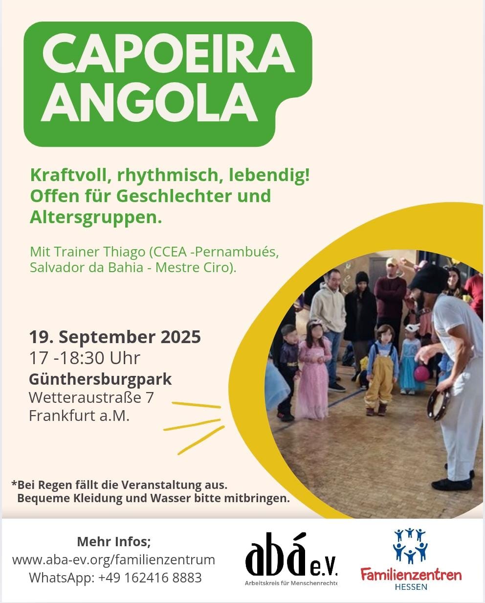 Ab diesem Freitag am 3.Oktober , 17:00 Uhr Für alle Altersgruppen und jedes Erfahrungslevel – jede*r ist willkommen! Was Sie brauchen: Bequeme Kleidung und Schuhe – mehr nicht! Ort: Familienzentrum Abá Wittelsbacherallee 183, 60385 Frankfurt am Main Anfahrt: Straßenbahn 14