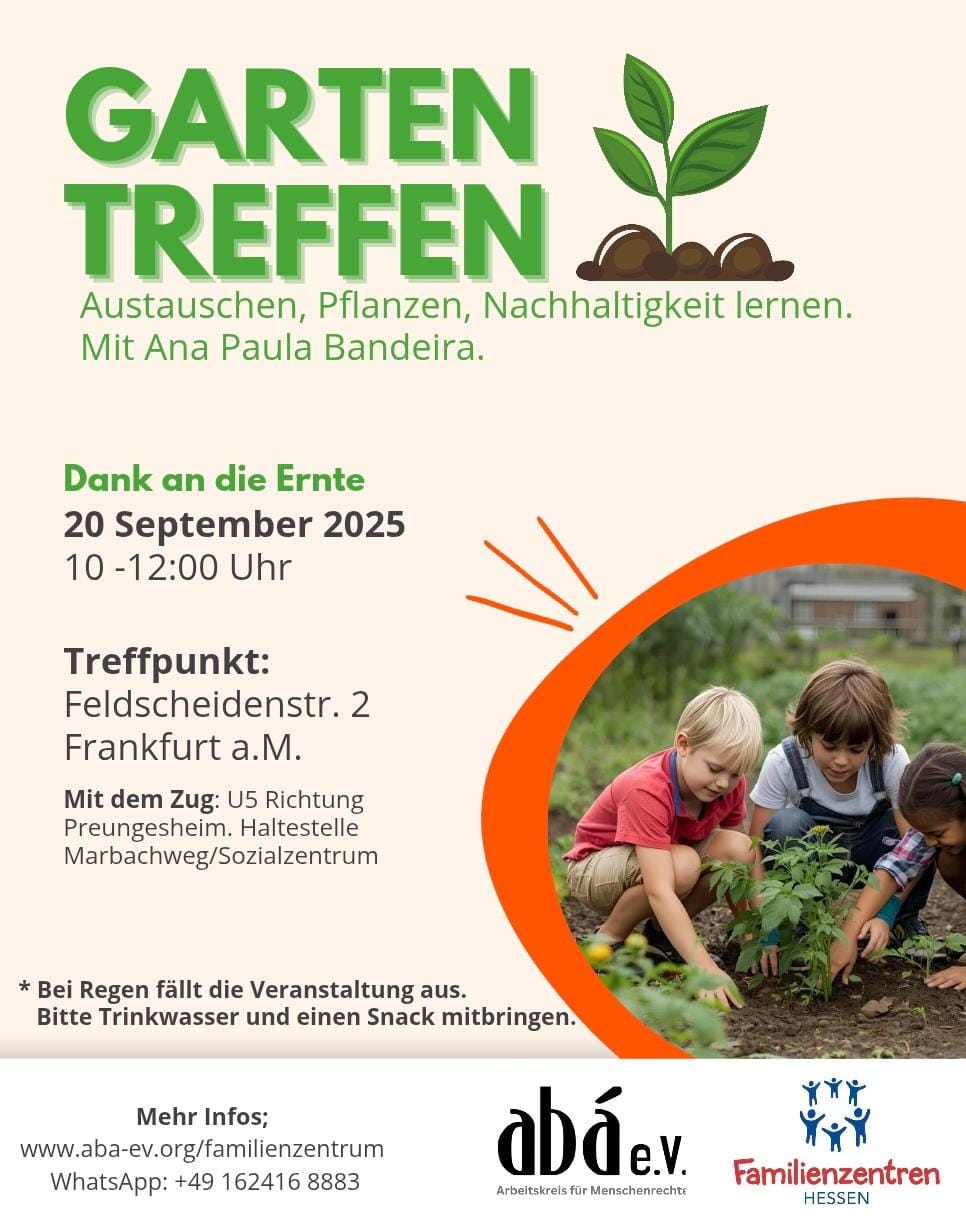 Austauschen, Pflanzen, Nachhaltigkeit lernen. Mit Ana Paula Bandeira Treffpunkt: Feldscheidenstr. 2 Frankfurt a.M. 🌿 Einladung zum Gartentreffen 🌿 Liebe Freundinnen und Freunde, unsere Gartentreffen finden noch bis Ende September statt, wir treffen uns immer am Samstag von 10 bis 12Uhr, das letzte Termin ist am 27.09. Wir sind jetzt in der Erntezeit, es gibt viele […]