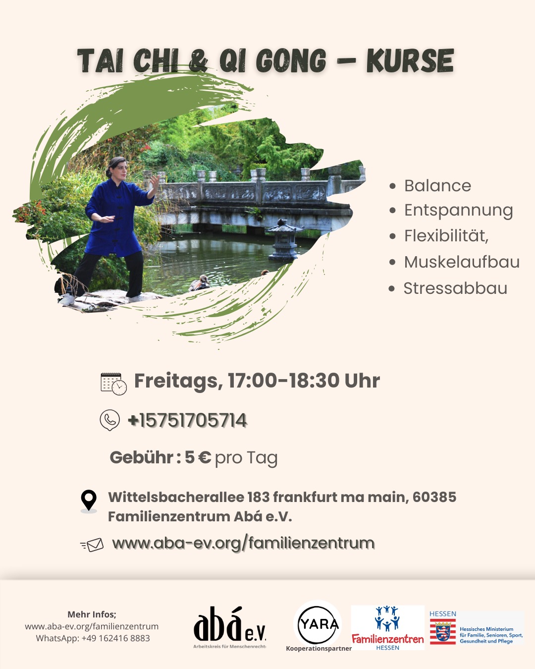 Ab diesem Freitag am 3.Oktober , 17:00 Uhr Für alle Altersgruppen und jedes Erfahrungslevel – jede*r ist willkommen! Was Sie brauchen: Bequeme Kleidung und Schuhe – mehr nicht! Ort: Familienzentrum Abá Wittelsbacherallee 183, 60385 Frankfurt am Main Anfahrt: Straßenbahn 14