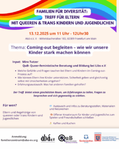 Thema: Coming-out begleiten – wie wir unsere Kinder stark machen können 13.12.2025 · 11:00–12:30 Uhr Abá e.V. II – Wittelsbacherallee 183, 60389 Frankfurt am Main